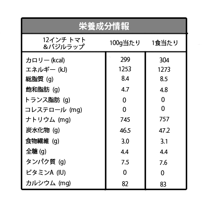 無漂白小麦粉、水、植物性ショートニング(パーム油ショートニング、ビタミンE)、トマト・バジル香味料[トマトパウダー、マルトデキストリン、香辛料(バジル、オレガノ、クミン)、二酸化ケイ素]、塩、砂糖、ベーキングパウダー(酸性ピロリン酸ナトリウム、重炭酸ナトリウム、タピオカでんぷん、重過リン酸石灰)、プロピオン酸カルシウム、重炭酸ナトリウム、フマル酸、イースト